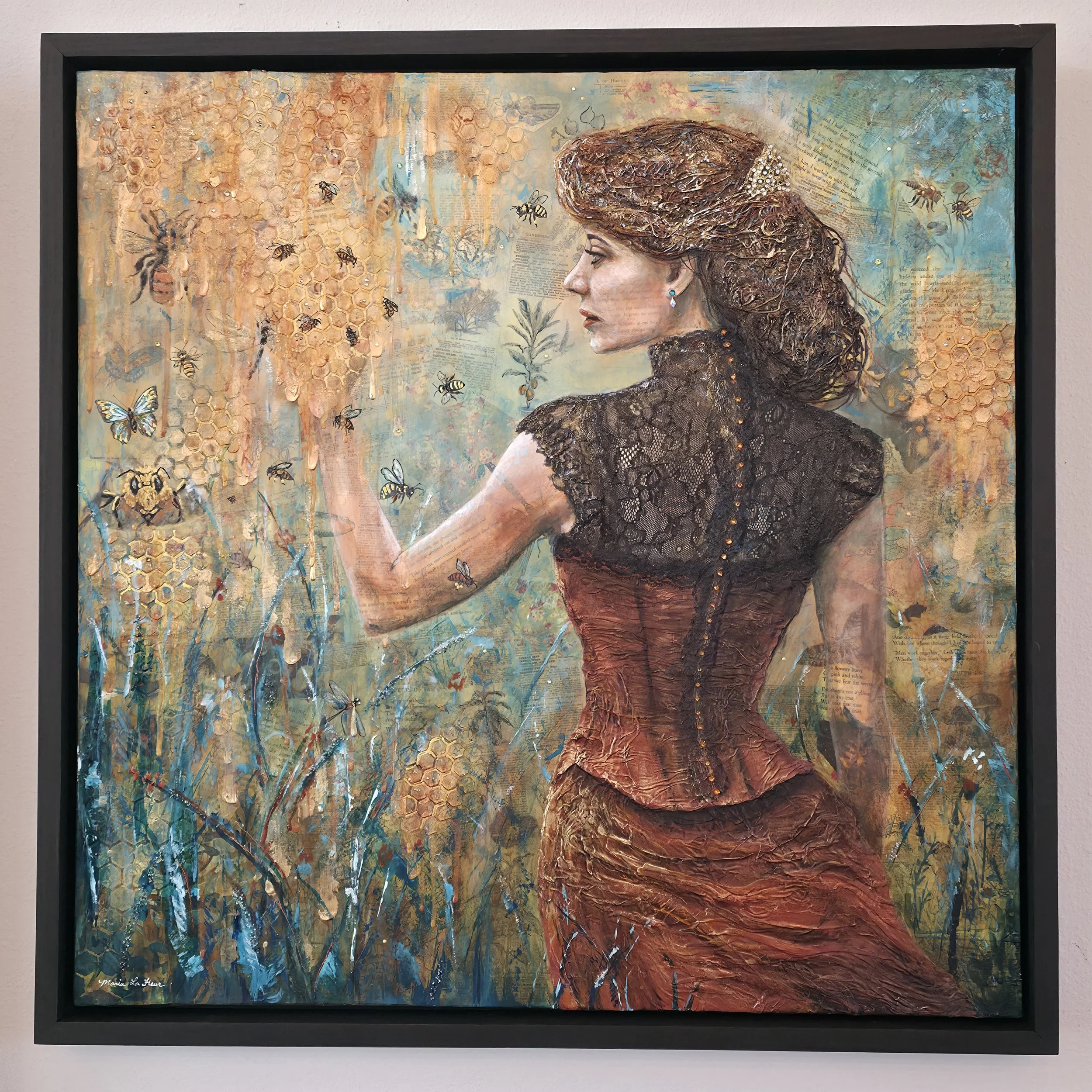 Mixed media with heavy texture, lace, gold highlights, rhinestones, crystals, and more. Mounted inside a handmade, wooden frame, ready to hang. Certificate of Authenticity provided.